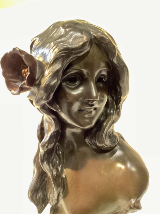 Sculptuur van een jonge vrouw met bloem in het haar op een groen marmeren basement