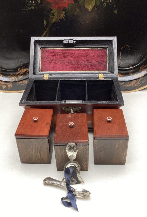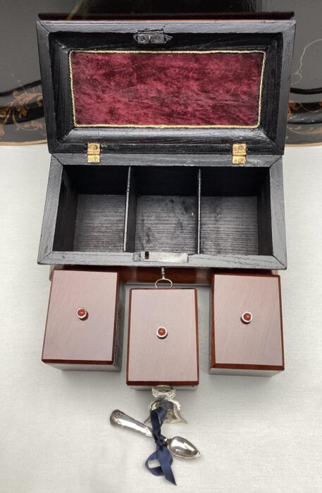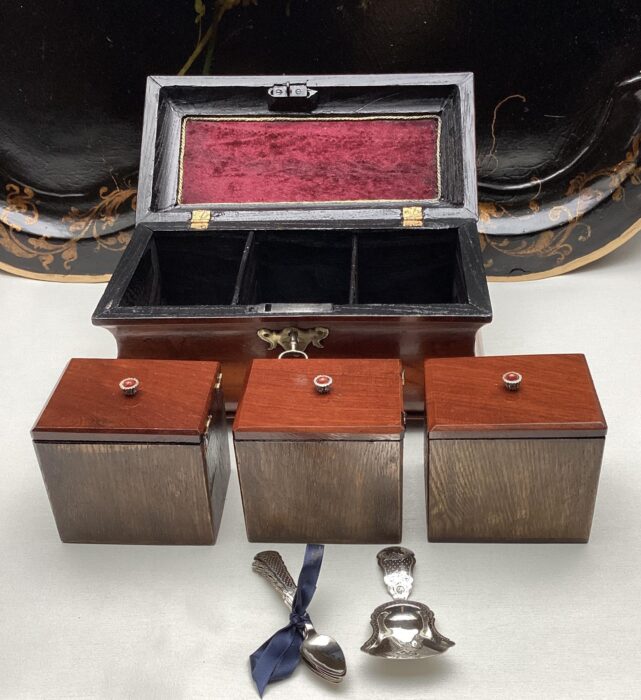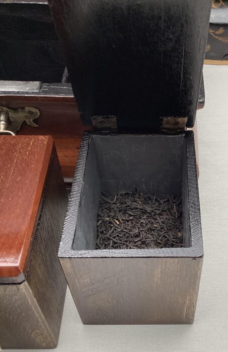 Met inhoud van drie containers van latere datum voorzien van loodpapier, Zes zilveren Biedermeier Theelepels en een Zilveren Theeduim, twee containers gevuld met Chinese zwarte thee