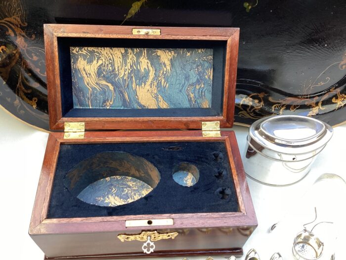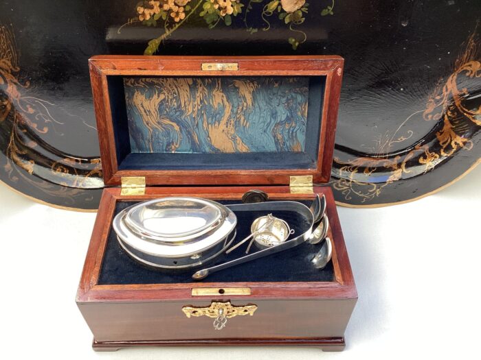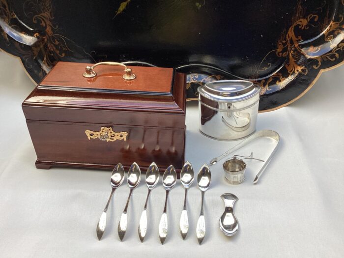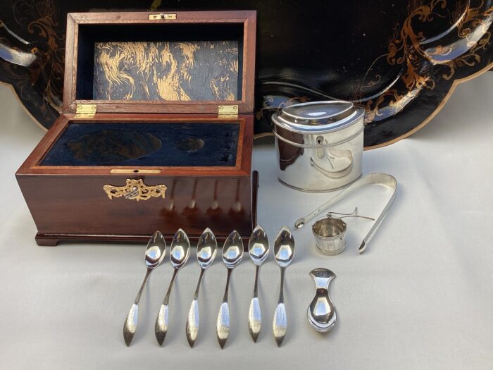 Hollandse theekist met zilveren Empire theegarnituur
