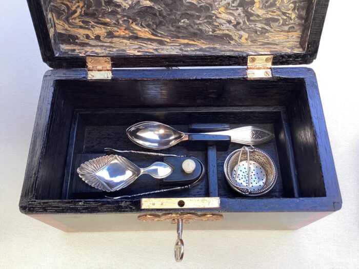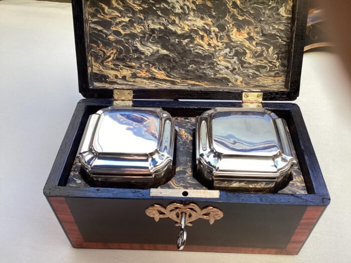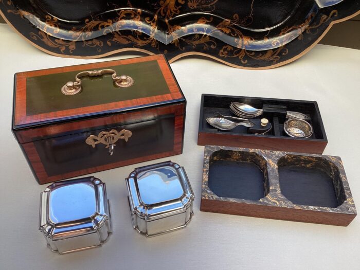 Louis Seize theekist gevuld met Zilveren Theeset en Zilveren Theedozen ca. 1790/1820
