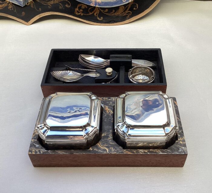 Gevuld met Zilveren theeset : Zes Empire theelepels, theeschep (1839)/tuitzeef (Amsterdam 1827-1862), klontjestang en twee zilveren theedozen 8x8x5cm (Aubert Den Haag ) totaal gewicht (430 gr 2e gehalte)