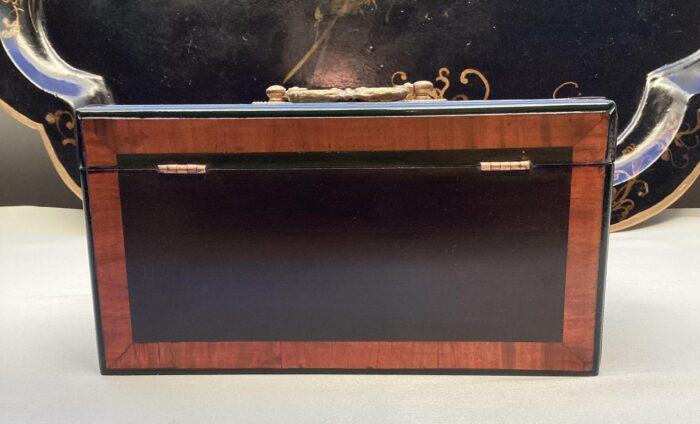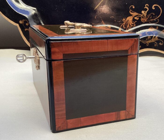 Louis Seize theekist van Cuba Mahonie afgezet met Padouk hout, verguld beslag met werkend slot en sleutel