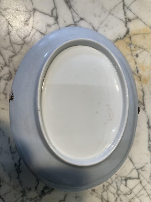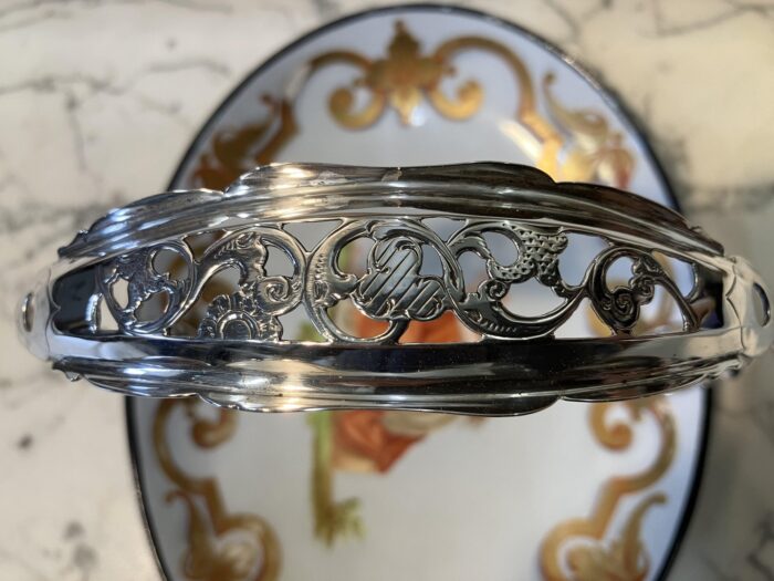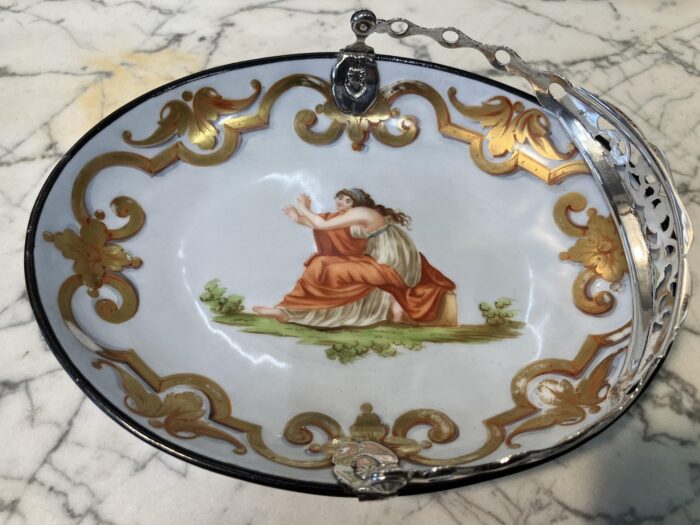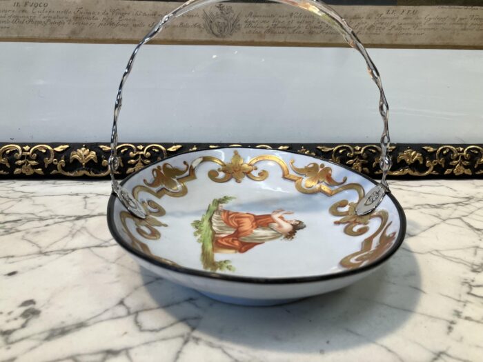 Porseleinen schaal met decor en zilveren hengsel 19e eeuw