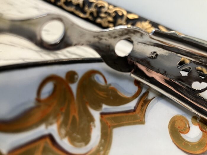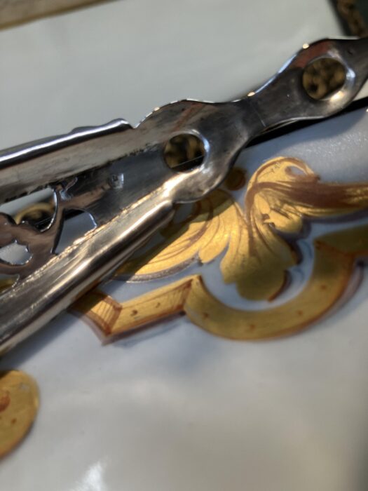 Porseleinen schaal met decor (vermoedelijk Duits) en Hollands 2e gehalte zilveren hengsel 19e eeuw met keuren