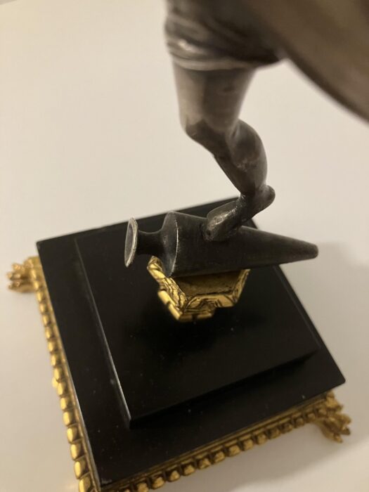Figuur van een waternimph en Hermes op onyx voet met vergulde leeuwenpoten, vergulde bobeches met kleine metaal restauratie aan voet (zie foto)