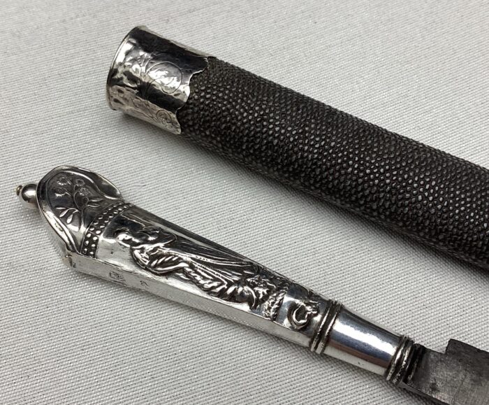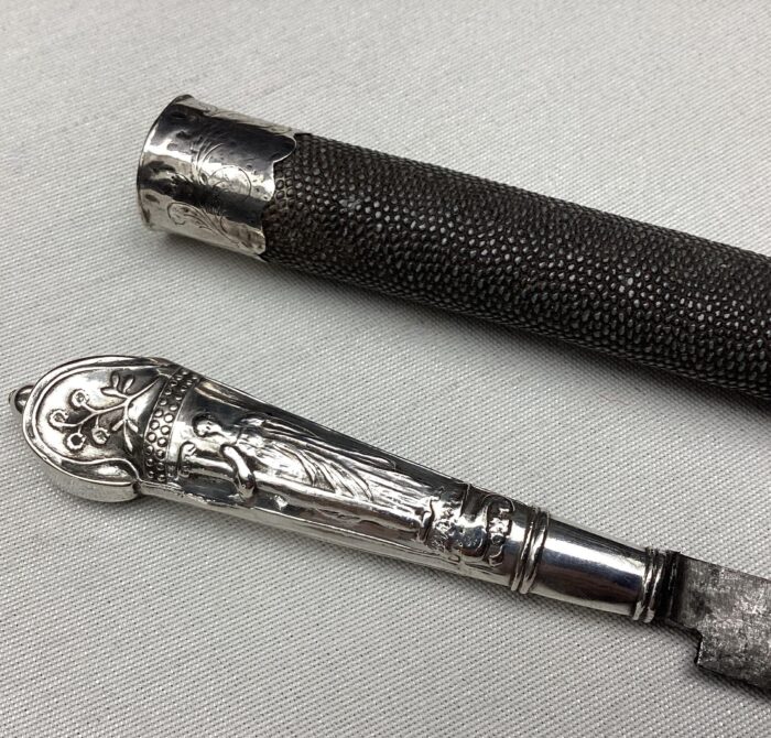 Op het zilveren heft afbeeldingen van bijbelse figuren